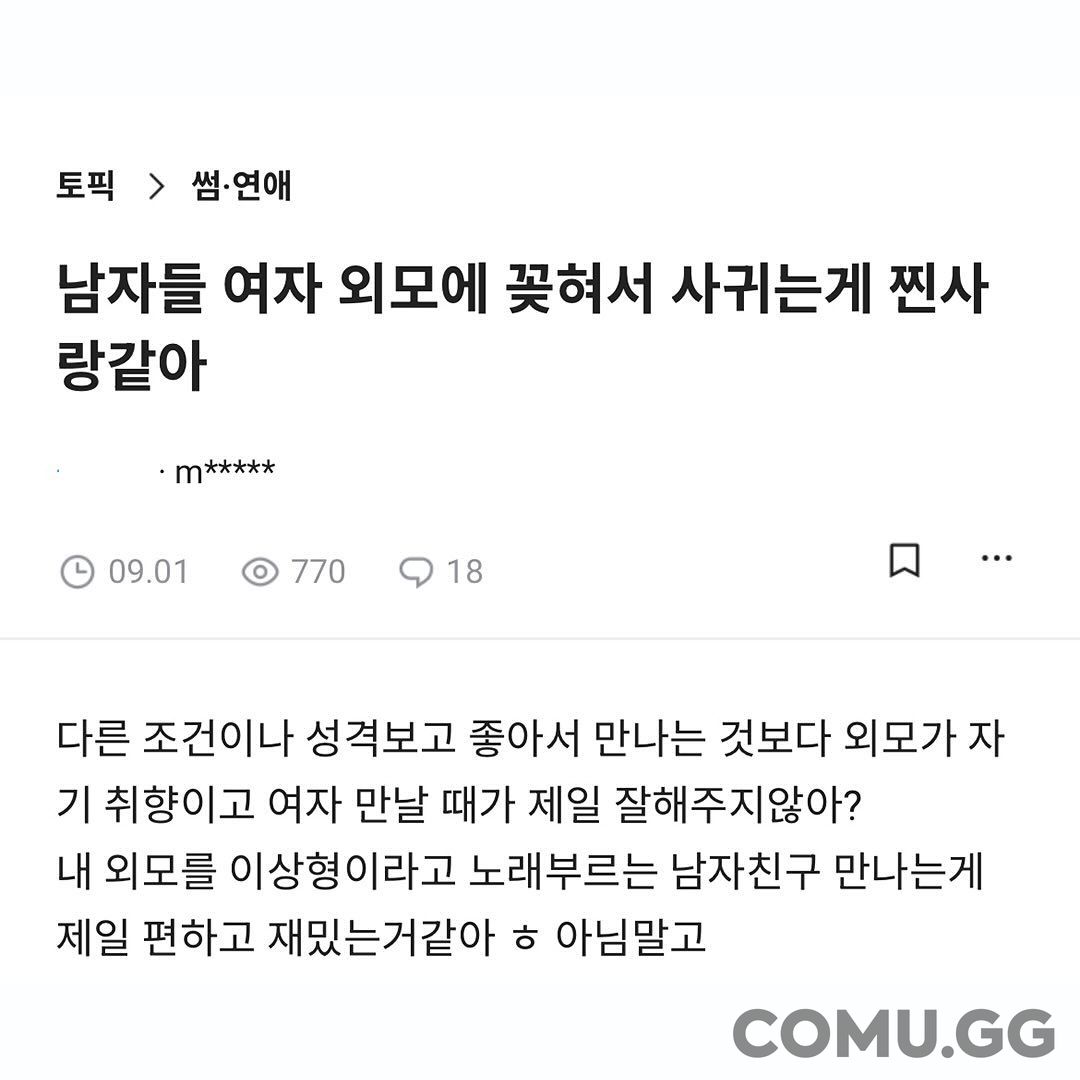 남자들 여자 외모에 꽂혀서 사귀는게 찐사랑 같아