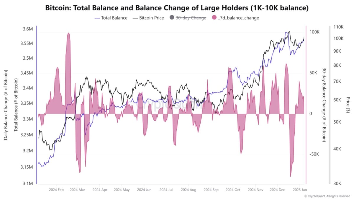 크립토퀀트 기고자 카우이코노미(caueconomy)는 "기관 투자자들이 최근 BTC 가격 하락에 대응해 지난 일주일 동안 약 79,000 BTC를 매도했다. 반면, 1,000~10,000 BTC를 보유한 일부 고래 주소들은 지난 30일 동안 34,000 BTC 이상(약 32억 3,000만 달러)을 매수하며 현물 시장에서 강한 매수 압력을 형성하고 있다"고 분석했다. 이어 "온체인 데이터를 살펴보면 개인 투자자들의 BTC 수요는 5년 내 최저 수준을 기록하고 있는 반면, 고래 투자자들은 꾸준히 물량을 축적하고 있다"며 "이는 개인 투자자들의 수요 감소에도 불구하고 고래와 기관 투자자들이 시장을 주도하고 있음을 보여준다"고 설명했다.
