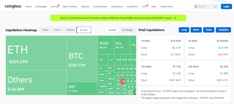 3일(현지시간) 온체인 분석 플랫폼 코인글래스에 따르면, 암호화폐 시장의 전체 청산 규모는 약 22억3000만 달러(한화 약 3조2687억 원)에 달했다.