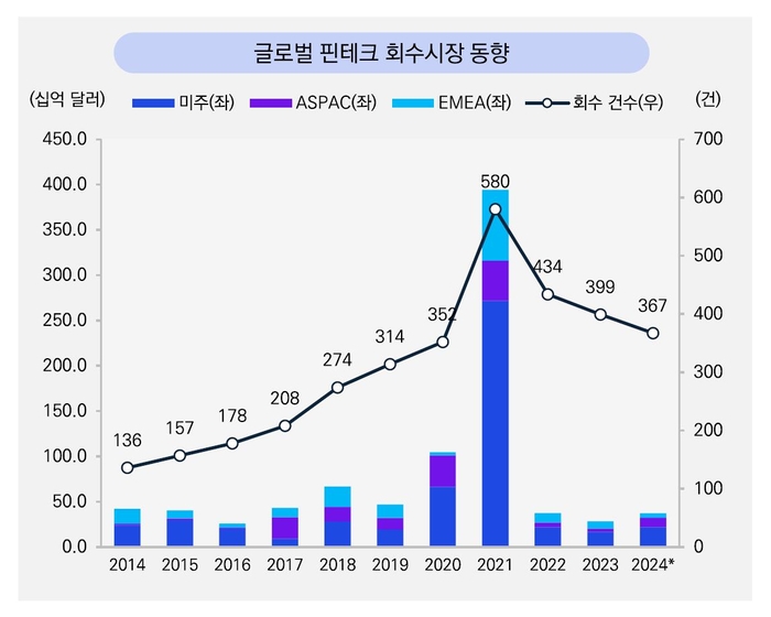 기업공개(IPO) 시장의 침체로 인해 핀테크 기업들이 투자금을 회수하기 어려운 상황이 지속되고 있다. 지난해 핀테크 기업의 투자 회수 규모는 373억 달러로 전년(285억 달러)보다 증가했으나, 회수 거래 건수는 2022년 399건에서 지난해 367건으로 줄었다.