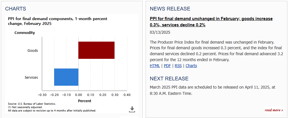 미국 노동부는 13일(현지시간) 2월 PPI가 0%의 상승률을 기록했다고 발표했다. 이는 시장 전망치였던 0.3% 상승을 크게 하회한 결과다.