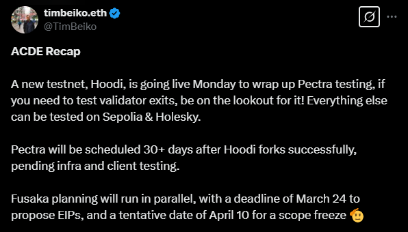 17일(현지시간) 펙트라 업그레이드 마무리를 위해 후디 테스트를 공개한다는 팀 베이코 (출처: @TimBeiko, X)
